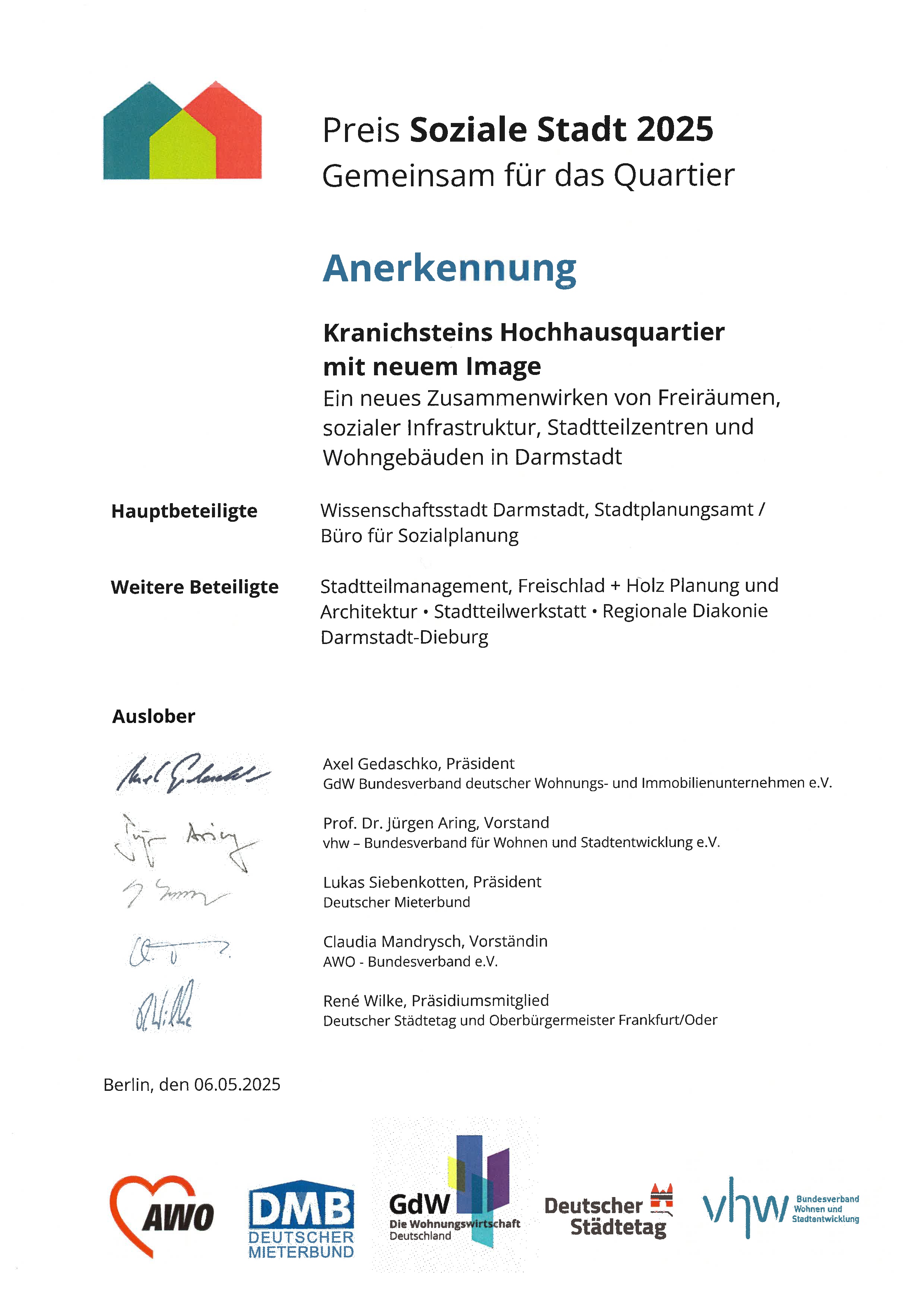 Urkunde 'Preis Soziale Stadt' 2025 Anerkennung 'Kranichstein Hochhausquartier mit neuen Image'