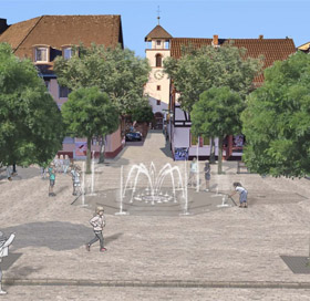 und Jahreszeiten vielfach veränderbare Wasserspiel bildet als Intarsie auf dem Marktplatz