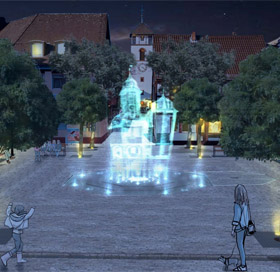 stunden holografisch erlebbar. In der Bodenplatte des Wasserspiels findet sich auch das